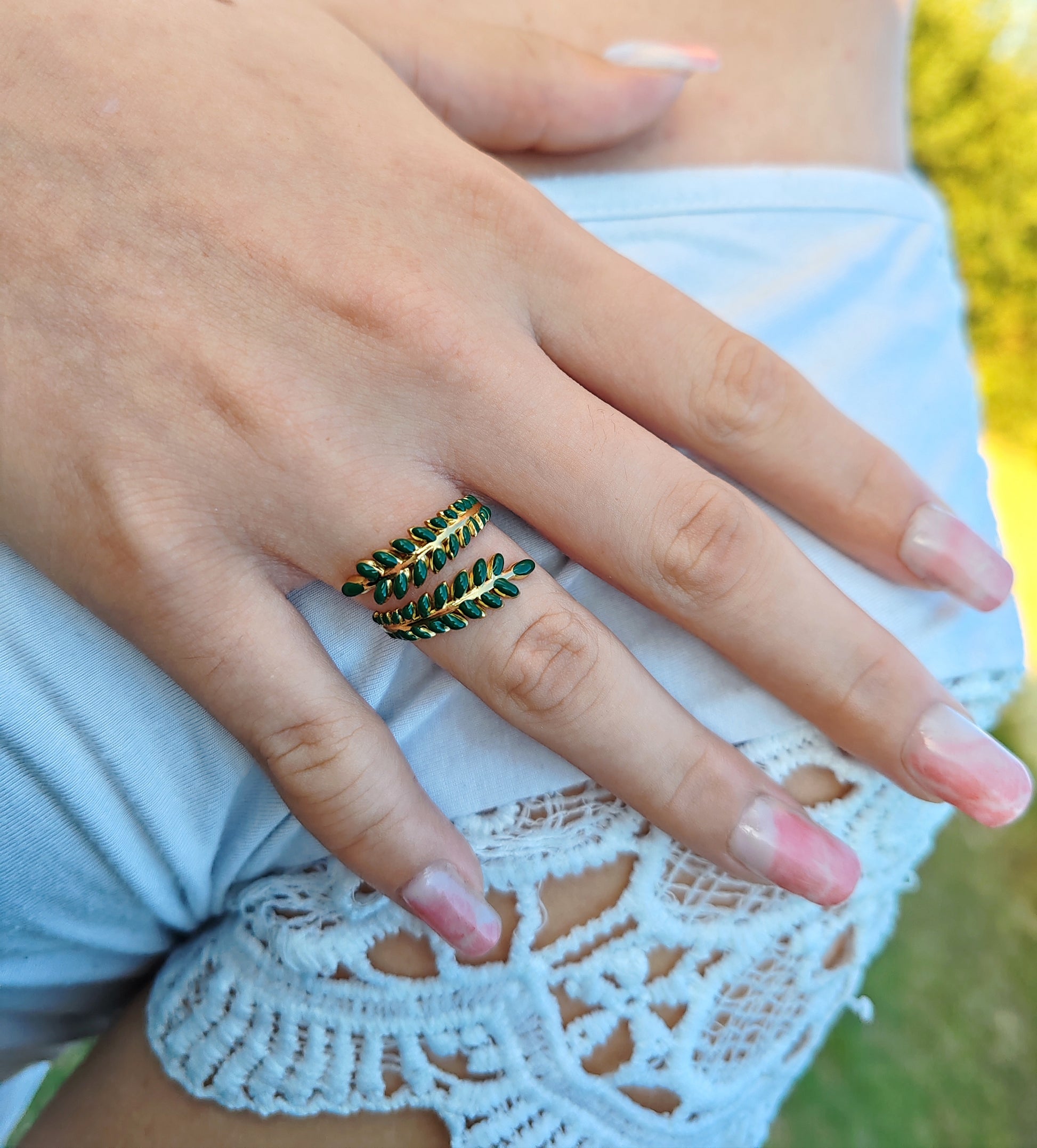 Bague doublée par son feuillage vert.