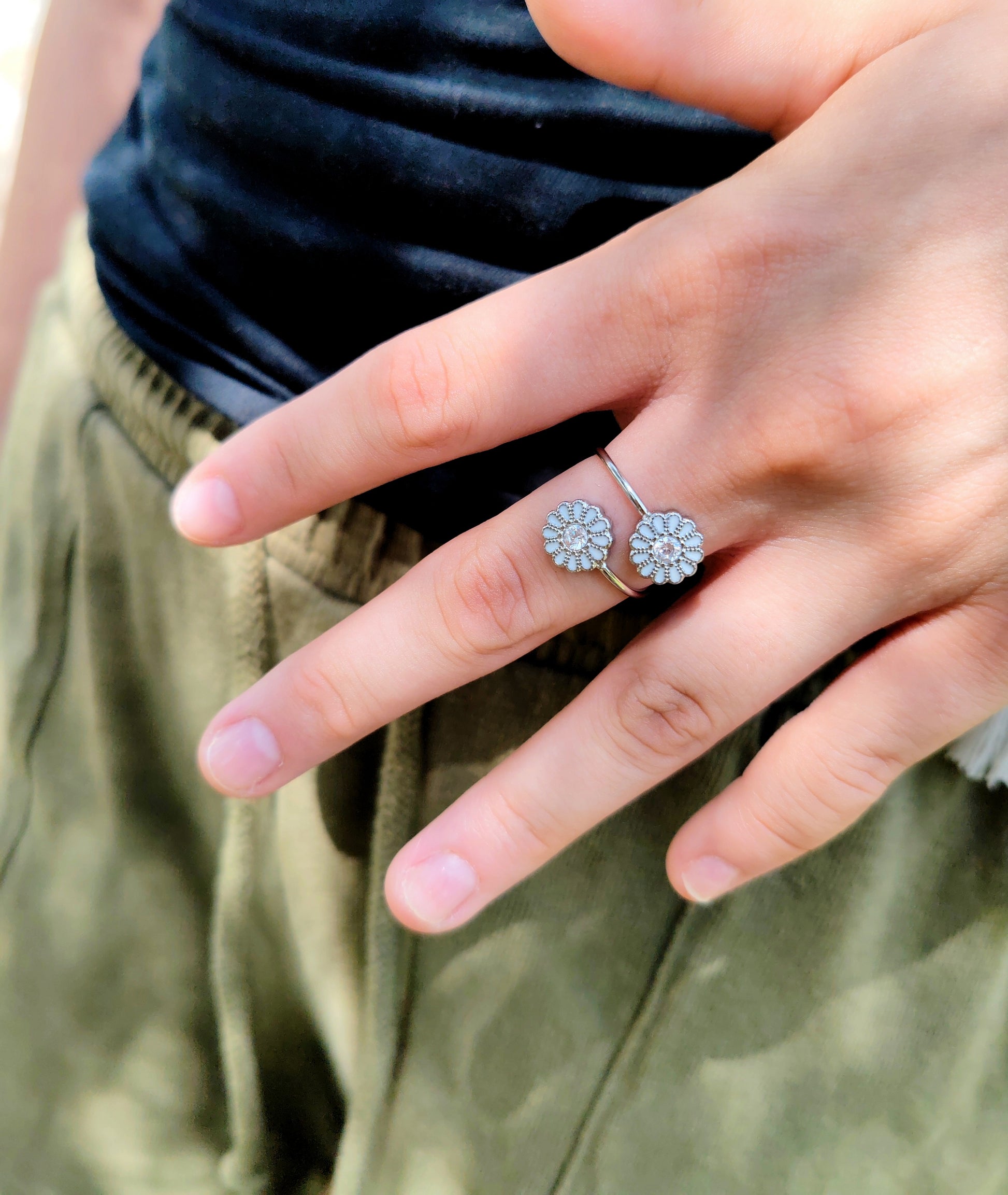 Bague sertie d'une pierre brillante au cœur de chaque marguerite.