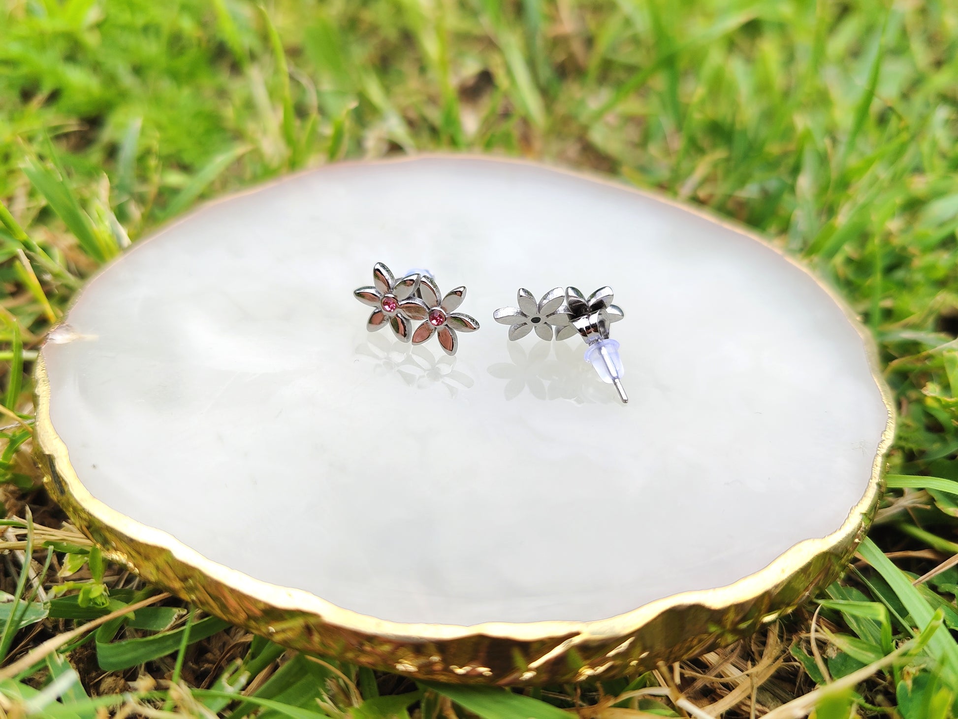 Chaque boucle d’oreille est décorée de deux fleurs, chacune sertie d’une pierre rose.