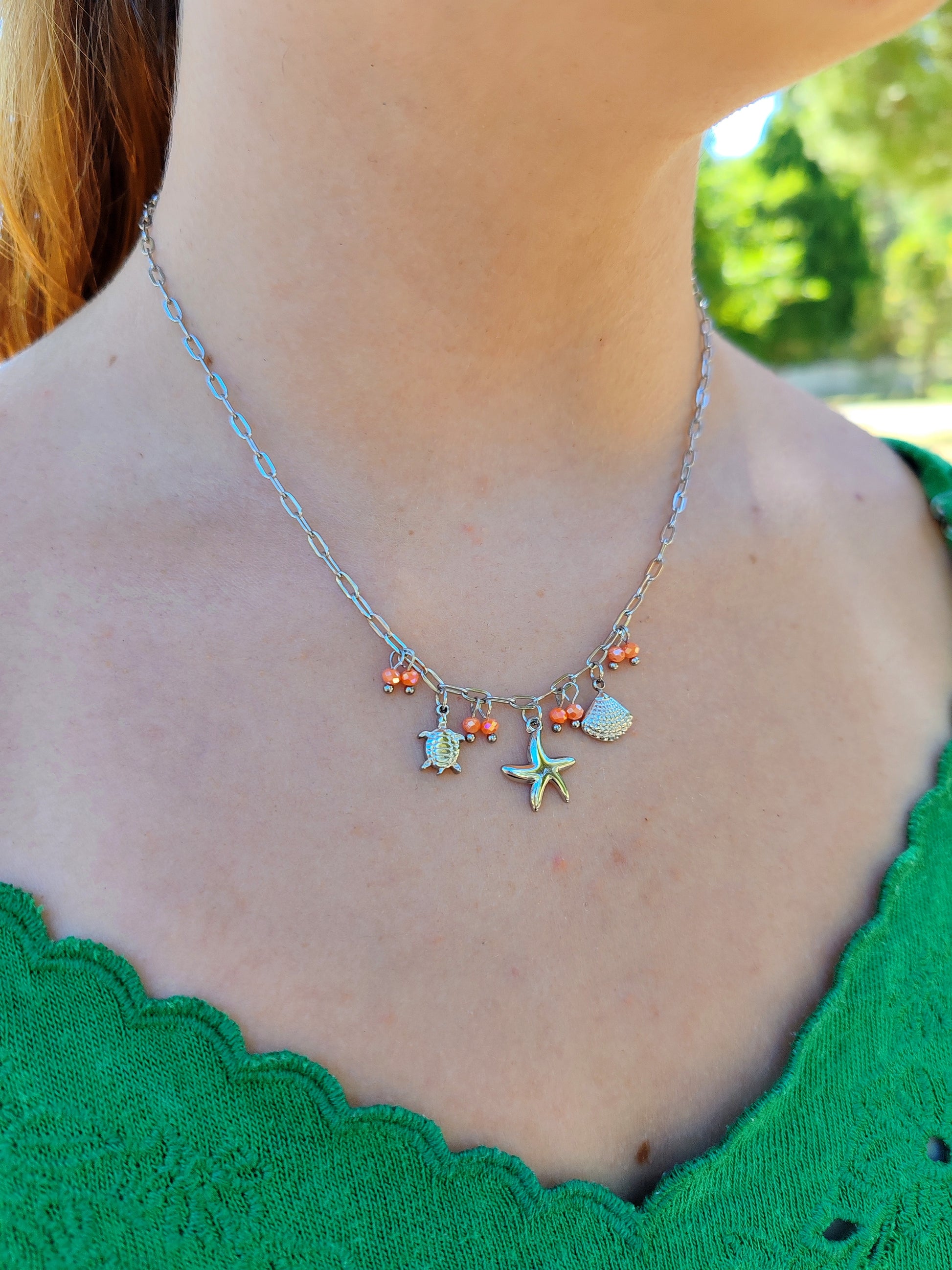 Collier orné de breloques d’été et de perles couleur corail nacré.